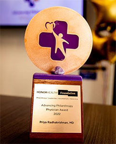Dr. Priya Radhakrishnan, Vice President & Chief Academic Officer, HonorHealth, partners with the Foundation, helping to secure millions in grant funding, including complex federal grants. She has also been instrumental in help us secure endowments for specialty fellowships and raise program funds to bring expert medical care and social services to the most vulnerable in our community. She also makes her own personal gift each year.