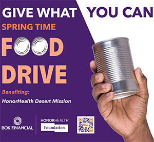 GIVE WHAT YOU CAN! Kicking off on April Food Day (April 1), HonorHealth Foundation and BOK Financial have partnered to fight hunger by raising funds and food throughout the month of April to benefit Desert Mission Food Bank. |