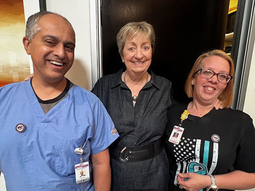 Ovation: Amy salutes her oncologist and team for five years of great care For the last five years, Amy, a retired Arizona nonprofit executive, has been battling ovarian cancer. Beside her on the entire journey has been Dr. Arvind Bakhru and his team. Amy recently joined the Foundation for a surprise visit to Dr. Bakhru’s office to present an Ovation award in tribute to his care and that of his entire team. Ovation is the Foundation’s grateful patient program, where patients or their loved ones can submit a tribute and charitable donation to honor someone who made a difference in their care. Amy couldn’t pass up the opportunity to share a warm “thank you” in person and read her tribute in front of the team: